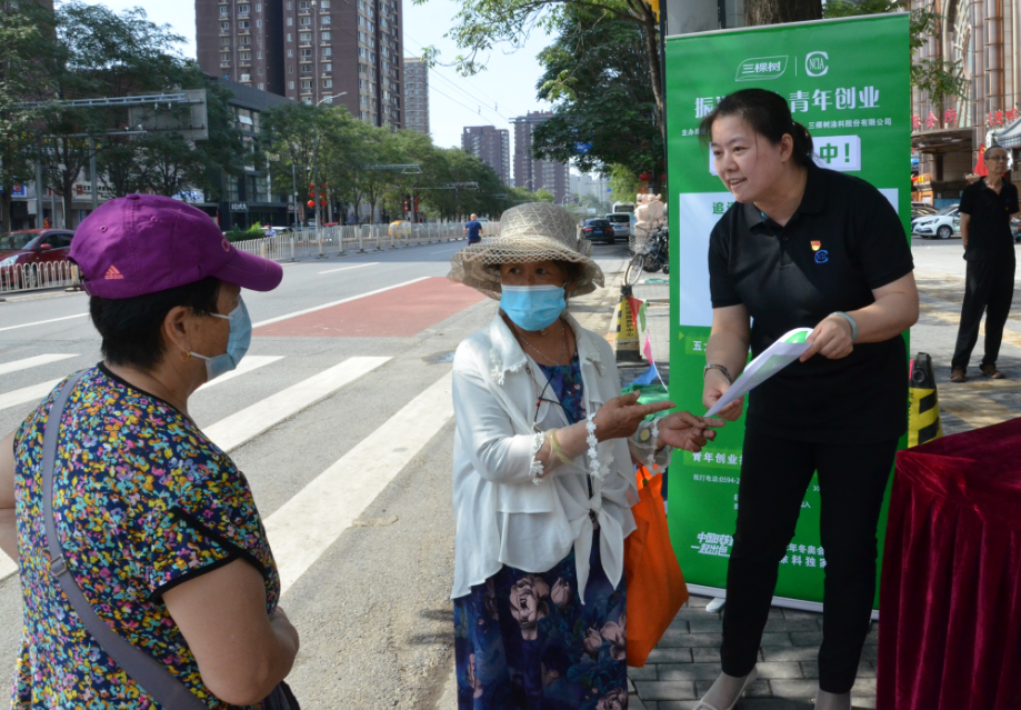 同时,为积极响应国家号召乡村振兴号召,推动青年创业深入开展,鼓励、引导、帮助青年人返乡创新创业,进一步推进美丽乡村建设发展,加快乡村振兴步伐。best365中国官方网站携手三棵树涂料股份有限公司,于全国范围内开展“振兴乡村 青年创业——三棵树2021年青年创业扶持计划”,对有志于下乡创业、建设美丽乡村的优秀青年们开展扶持。best365中国官方网站在主题党日活动现场,因地制宜,走上街头,为此次开展的青年创业扶持计划进行宣传和推广。