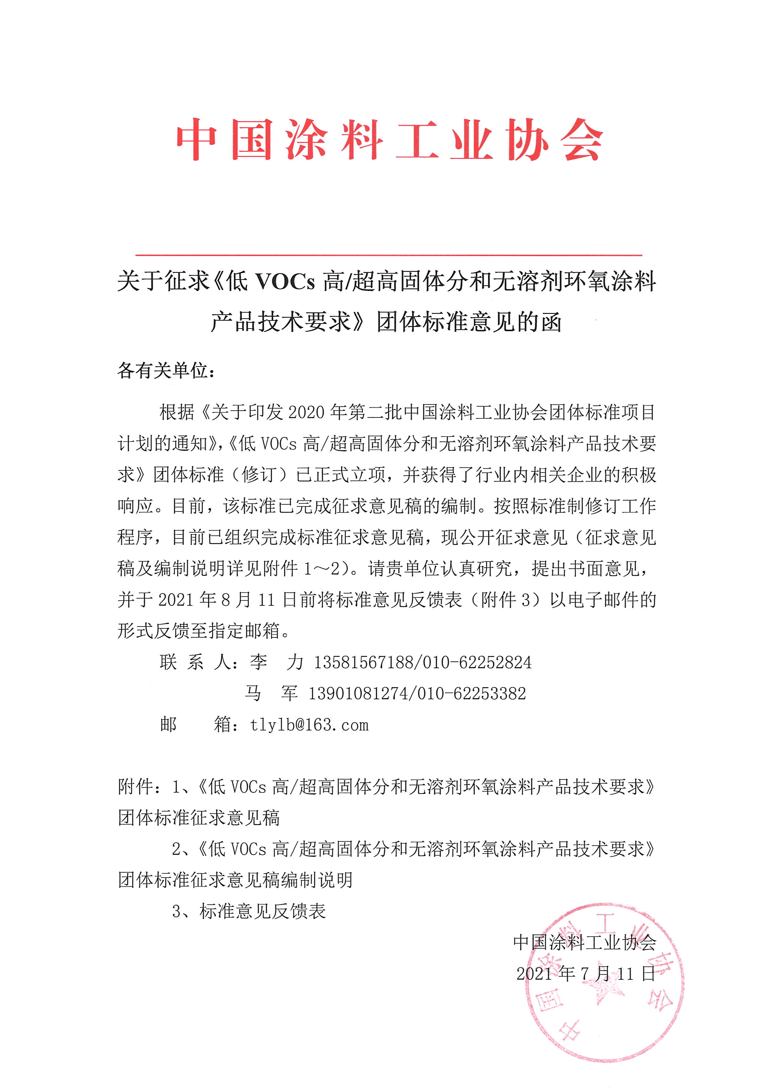 根据《关于印发2020年第二批best365中国官方网站团体标准项目计划的通知》,《低VOCs高/超高固体分和无溶剂环氧涂料产品技术要求》团体标准(修订)已正式立项,并获得了行业内相关企业的积极响应。目前,该标准已完成征求意见稿的编制。按照标准制修订工作程序,目前已组织完成标准征求意见稿,现公开征求意见(征求意见稿及编制说明详见附件1~2)。请贵单位认真研究,提出书面意见,并于2021年8月11日前将标准意见反馈表(附件3)以电子邮件的形式反馈至指定邮箱。