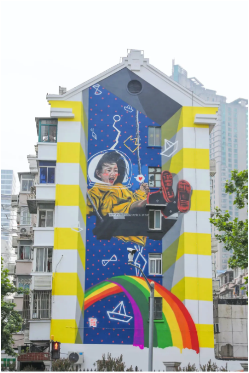 中国艺术家TIN.G米央在浦东新区金杨路云山路路口创作了《小小宇航员》,孩子灿烂的笑容和美丽的生态环境需要大家一起守护;