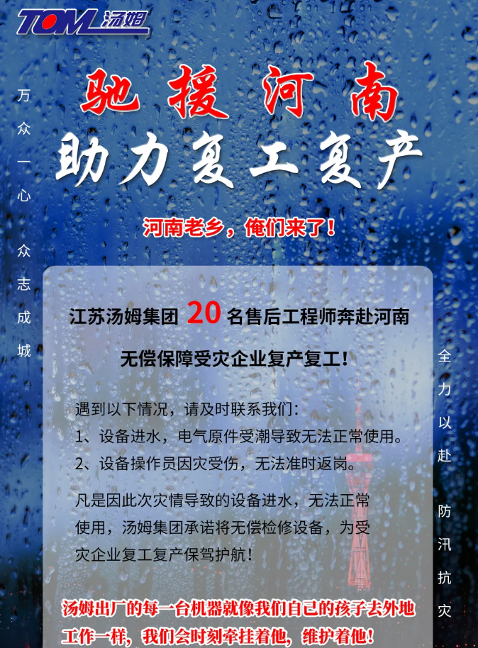 汛情期间凡是因此次灾情导致的设备进水,无法正常使用,汤姆集团承诺将无偿检修设备,为受灾企业复工复产保驾护航!