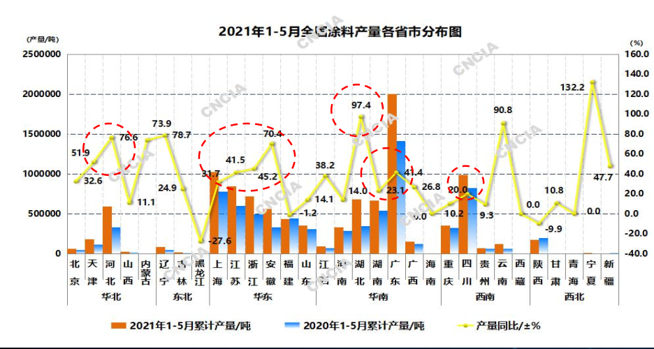 2021年上半年(1–5月)中国涂料行业各省市产量分析