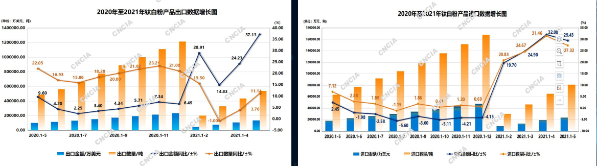 原材料方面,据刘杰介绍,经海关总署统计,2020年5月至2021年5月期间,钛白粉出口增速平稳,出口金额增速明显高于出口量增速,说明国内国际钛白粉市场价格增长较快,需求依然较为旺盛。进口方面,2020年期间进口处于平稳走低趋势,且进口金额降低速度更快,说明国际向国内输送钛白的弱势明显,国内企业更具竞争力;而2021年上半年,进口增速逆势反升,金额和数量涨势同步,较为反常,但体量较低,截至5月份累计进口约8.1万t,分析原因可能是国内产品价格快速上涨,与国际产品价格相当后,下游企业选择性更多。
