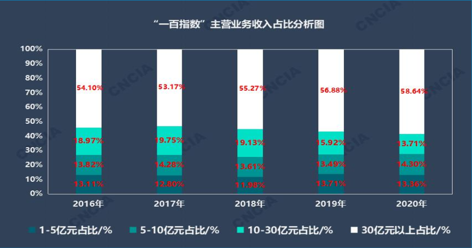 “一百指数”企业方面,2016年至2020年期间,主营业务收入高于30亿元的企业其主营业务收入占全行业的比例由54.1%上涨至58.64%;主营业务收入在10亿~30亿元的企业在全行业的占比由2016年的18.97%降低至2020年的13.71%。值得注意的是,“十三五”期间,主营业务收入在10亿~30亿元区间的企业其主营业务收入增减幅曲线出现较为明显下滑,刘杰认为,其主要原因在于“十三五”中期,面临环保压力、宏观调控、市场导向等因素,部分企业增速进入转折点。