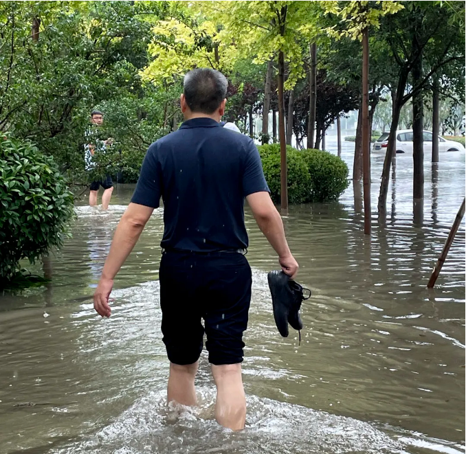 次日一大早,李董又马不停蹄地前往安阳跟线。遭遇强暴雨的安阳,公交停运、高速封闭、航班取消。李董被困安阳,亲历灾情现场,仍不顾自身安危,时刻牵挂着客户。他脱下鞋子,挽起裤腿,蹚着漫过膝盖的积水,察看项目,与十几位客户做了交流,表达了深切的慰问。