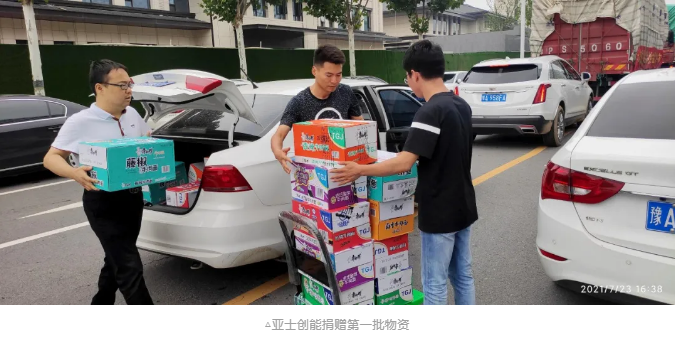 7月23日,亚士创能防水事业群河南省区员工在做好生产自救的同时,自发组织捐款捐物,将亚士创能第一批救援物资捐助郑州市红十字会。