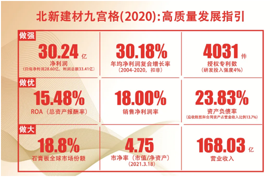 北新建材1979年在邓小平同志的指示下成立,1997年在深圳证券交易所上市。2004年以来,北新建材制定“聚焦战略”和“制高点战略”,进行全国产业布局,从北京一个基地发展成为遍布全国100多个产业基地,石膏板业务规模从年产4500万平方米位居中国第三发展到2020年的33亿平方米布局,稳居全球第一,并全面启动50亿平方米石膏板产业布局。北新建材以“技术创新”和“品牌建设”为公司两大战略引擎,实施“双线择优”管理模式,成功打造了技术、质量、品牌、档次、效益、规模全面超过跨国公司的中国自主高端品牌,在一个充分竞争、完全开放的普通制造业赢得全国60%的市场份额,全国各地地标建筑第一高楼乃至获得鲁班奖等国家工程奖的重点工程90%采用的是“龙牌”系列产品,实现了经济效益、经营质量、市场份额的全面超越。