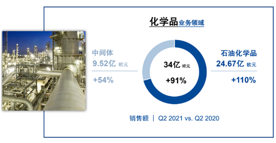 化学品业务领域销售额较去年同期大幅提升91%,为34亿欧元。这主要是由于产品供应量不足导致市场需求旺盛,从而令价格水平显著提升。不计特殊项目的息税前收益为9.90亿欧元,较去年同期大幅提升。这主要是石油化学品业务部不计特殊项目的息税前收益大幅提升所致;中间体业务部不计特殊项目的息税前收益也有大幅提升。