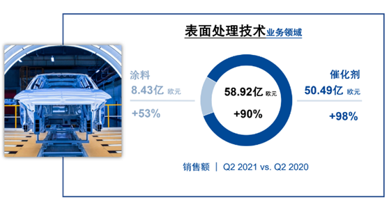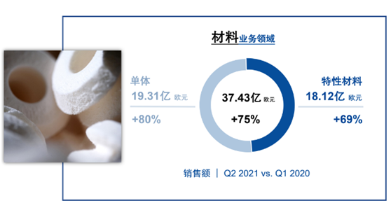 与2020年第二季度相比,2021年第二季度材料业务领域销售额增长75%,为37亿欧元,主要由于市场需求带动销量显著提升。其下两个业务部不计特殊项目的息税前收益大幅提升,为7.92亿欧元。