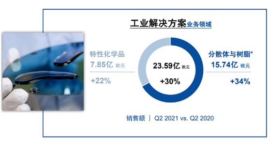 工业解决方案业务领域2021年第二季度销售额为24亿欧元,较去年同期大幅提升,特别是在分散体与颜料业务部。这两个业务部几乎所有业务销量均有增长,为销售额提升作出了贡献。两个业务部不计特殊项目的息税前收益较去年同期有大幅提升,为3.07亿欧元。自2021年7月1日起,由于巴斯夫已完成对其全球颜料业务的剥离,分散体与颜料业务部更名为分散体与树脂业务部。