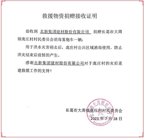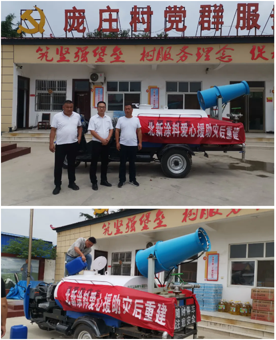 此时的庞庄村,大水逐渐退去,交通逐步恢复,正是病毒防范的关键时刻。当天开完会,庞会彬便带着同事们的慰问赶回郑州,购置救援物资消毒雾炮车一台。第二天一早,便驱车为庞庄村全村公共区域进行消杀工作。大周镇庞庄村村民委员会对北新建材的爱心援助表示感谢。