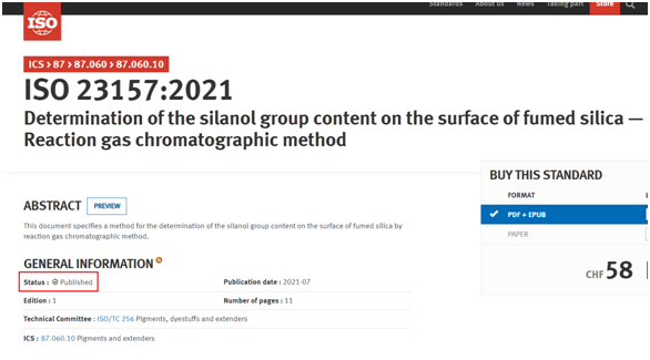 2021年7月13日,ISO 23157:2021《气相二氧化硅表面硅羟基含量的测定—反应气相色谱法》正式出版发行。该标准是继湖北汇富纳米材料股份有限公司全资子公司-广州汇富研究院有限公司主导完成ISO 18473-3:2018《硅橡胶用气相二氧化硅》国际标准制定任务后,又完成的另外一项重量级的国际标准制定任务。
