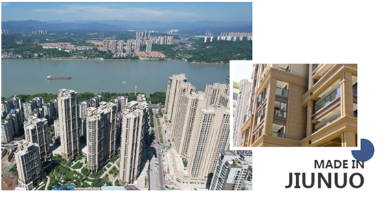为了彰显城市封面地标的风采,项目外立面采用的是久诺创新研发专属该项目的定制产品:岩片含量10%的定制版岩片花岗真石漆,该产品以高级水性耐候乳液,天然优质彩砂,树脂岩片,配以高级别进口助剂调制而成。既具有逼真的石材纹理,又有石材的使用寿命,在喷涂成膜过程中一次性呈现在墙体上,呈现高保真的天然石材纹理效果。如此一来,无论是站在百米以外,还是站在近处观察细节,都能处处感受到它的奢华品质感。