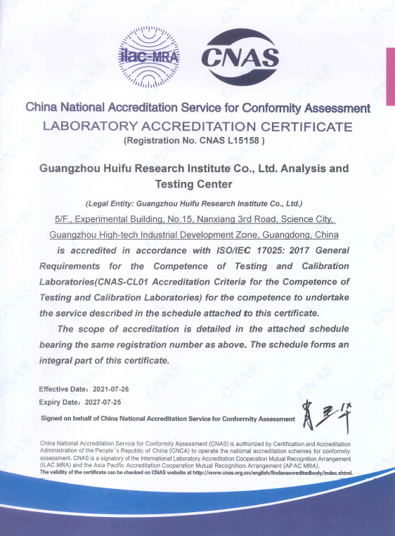 2021年7月,湖北汇富纳米材料股份有限公司全资子公司-广州汇富研究院有限公司旗下分析测试中心正式获得中国合格评定国家认可委员会(CNAS)实验室认可证书,证书编号:CNASL15158。该认可获得,标志着广州汇富研究院有限公司分析测试中心已具备依据国际认可准则开展检测服务的技术能力,其硬件设备、管理水平及检测能力达到国际认可标准,其出具的检测结果符合国内、国际认可准则要求,充分展示了汇富纳米股份在纳米粉体材料检测领域专业性、权威性和公正性。