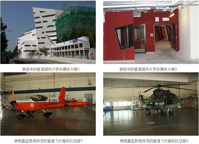 嘉宝莉漆自今年初进军香港市场以来,初战告捷,现已被香港特别行政区的多家知名工程选用,并在建筑工程商中留下了良好的口碑。据嘉宝莉漆香港总经销商黄冠峰总经理介绍,从年初开始合作的香港城市大学多媒体大楼目前仍在紧张的施工过程中,已有超过1万平方米的内墙选用嘉宝莉漆进行涂装。而今年11月,嘉宝莉地坪漆再次被香港飞行服务队总部地面翻新工程成功选用,施工面积达500平方米。