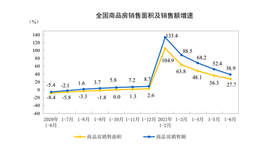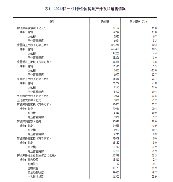 1—6月份,商品房销售面积88635万平方米,同比增长27.7%;比2019年1—6月份增长17.0%,两年平均增长8.1%。其中,住宅销售面积增长29.4%,办公楼销售面积增长10.0%,商业营业用房销售面积增长5.7%。商品房销售额92931亿元,增长38.9%;比2019年1—6月份增长31.4%,两年平均增长14.7%。其中,住宅销售额增长41.9%,办公楼销售额增长10.7%,商业营业用房销售额增长8.8%。