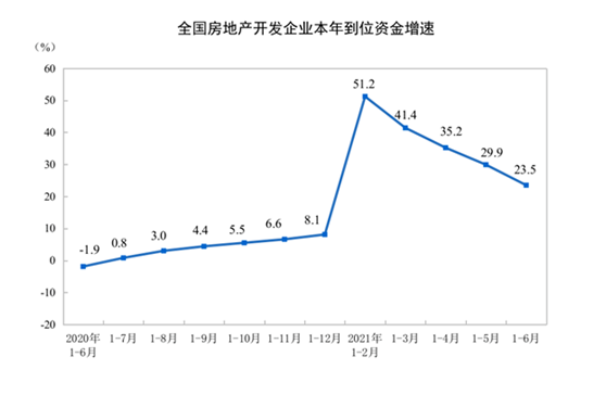 1—6月份,房地产开发企业到位资金102898亿元,同比增长23.5%;比2019年1—6月份增长21.1%,两年平均增长10.0%。其中,国内贷款13465亿元,下降2.4%;利用外资42亿元,下降9.1%;自筹资金30153亿元,增长11.9%;定金及预收款39625亿元,增长49.7%;个人按揭贷款16355亿元,增长23.9%。