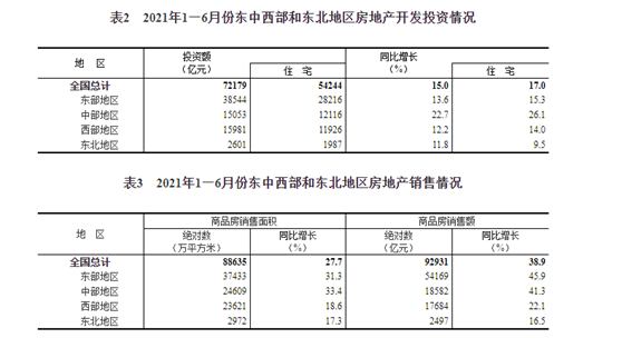 1—6月份,东部地区商品房销售面积37433万平方米,同比增长31.3%;销售额54169亿元,增长45.9%。中部地区商品房销售面积24609万平方米,增长33.4%;销售额18582亿元,增长41.3%。西部地区商品房销售面积23621万平方米,增长18.6%;销售额17684亿元,增长22.1%。东北地区商品房销售面积2972万平方米,增长17.3%;销售额2497亿元,增长16.5%。