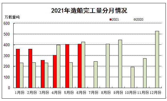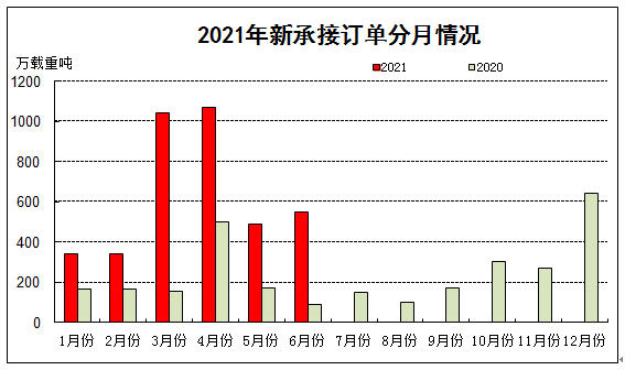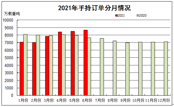 2021年上半年,全国造船完工量2092万载重吨,同比增长19.0%;承接新船订单量3824万载重吨,同比增长206.8%。截至6月底,手持船舶订单量8660万载重吨,同比增长13.1%,比2020年底手持订单增长21.8%。