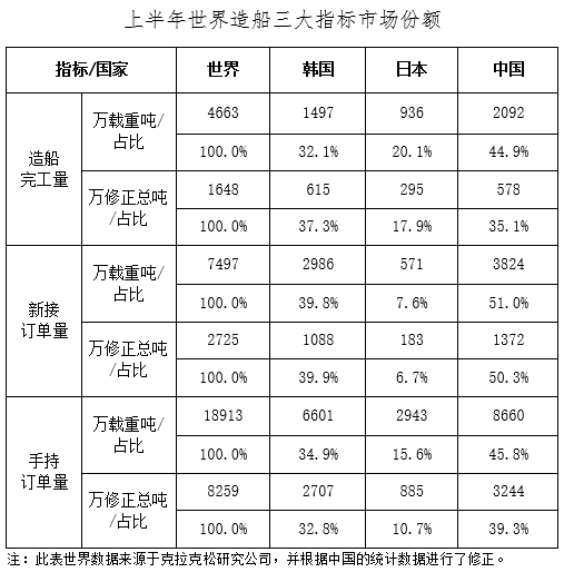全国完工出口船1975万载重吨,同比增长20.1%;承接出口船订单3415万载重吨,同比增长197.8%;6月底,手持出口船订单7707万载重吨,同比增长9.4%。出口船舶分别占全国造船完工量、新接订单量、手持订单量的94.4%、89.3%和89%。