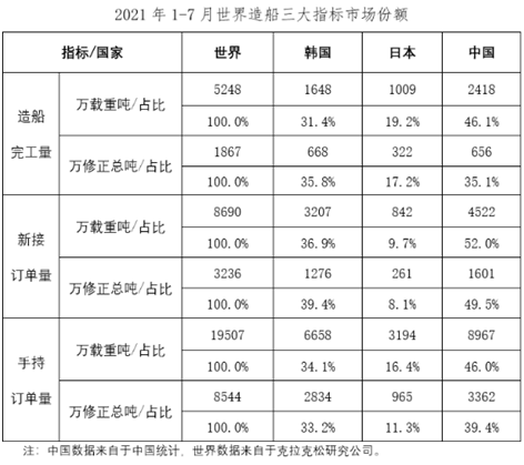 1~7月,我国造船完工量、新接订单量、手持订单量分别占世界市场份额的46.1%、52.0%和46.0%。