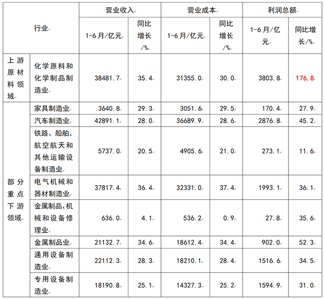 上半年,在41个工业大类行业中,39个行业利润总额同比增加,1个行业扭亏为盈,1个行业持平。在涂料行业相关上下游领域,其中化学原料和化学制品制造业增长1.77倍,利润总额同比增长超过176.8%(表1),远高于其行业营业收入增长率及成本增长率,说明化学原料和化学制品制造市场价格基本上保持高位运行;而下游包括汽车制造、家具制造、机械制造等领域营收增长平均在25%左右,较涂料行业上半年主营业务收入增速34.4%(以2020年同期数据作为对比基数)略低,说明下游市场活跃性仍偏低,对涂料市场的正向拉动还略显不足。进入下半年,尤其是第三季度,涂料下游市场的活跃性和需求将极大程度决定涂料行业本年度营收和利润增长幅度。