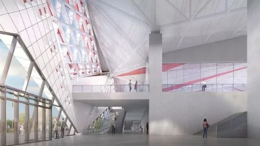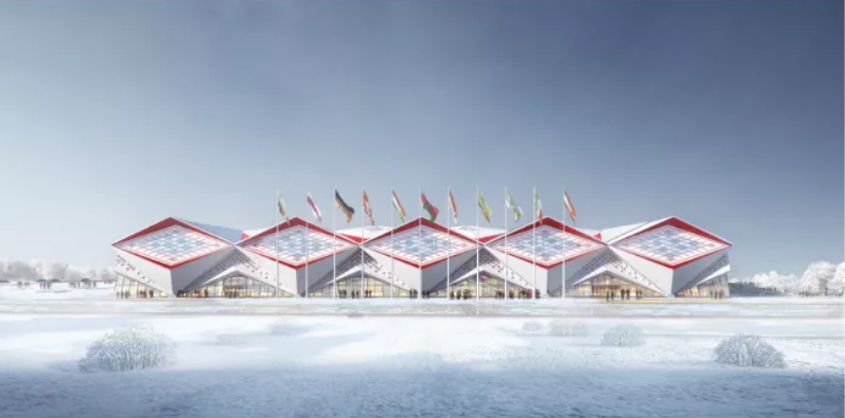 游泳馆的整体建筑造型源于白俄罗斯国旗上的民族纹饰,体现了白俄罗斯深厚的传统文化;建筑的红色象征不屈的民族精神;景观的绿色寓意蓬勃的国家希望;中国结的单元造型,体现中国元素;手拉手的建筑形式,展现中白友谊。
