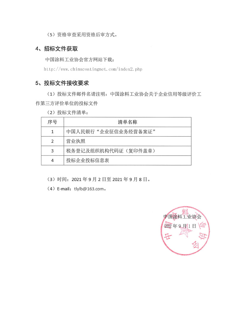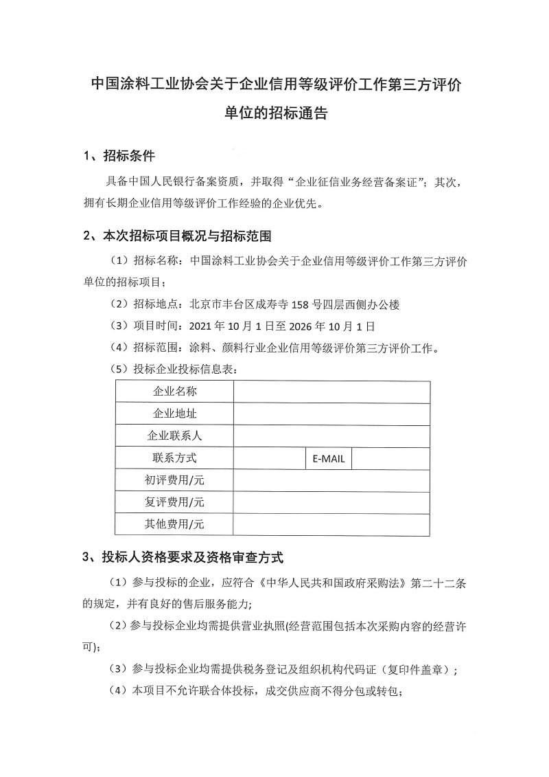 (4)招标范围:涂料、颜料行业企业信用等级评价第三方评价工作。