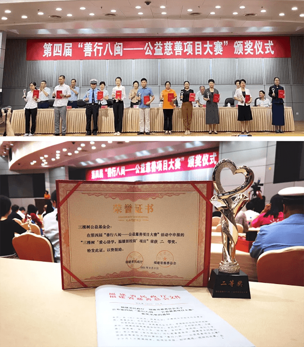 8月31日-9月2日,由福建省民政厅指导、福建省慈善总会主办的第四届“善行八闽——海峡公益慈善项目大赛”颁奖仪式在福州西湖宾馆举行。三棵树“爱心助学·温暖留校园”项目从341份参赛项目中脱颖而出,荣获大赛二等奖,三棵树公益基金会理事长徐荔芳女士代表基金会上台领奖。