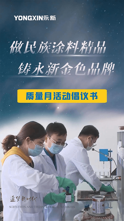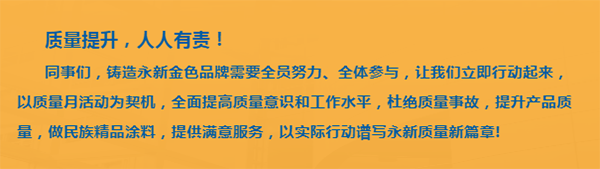 金秋九月,我们迎来了2021年全国“质量月”。质量是企业之本,品牌是公司之魂,提升产品质量和管理水平是企业立于不败之地的根本保证。在当前市场形势下,我们应该进一步增强质量意识、竞争意识和效益意识,坚持以创新为动力,以质量为基础,以客户为中心,以效益为目标,以饱满的热情、昂扬的斗志、扎实的工作为提升产品质量和品牌形象作出应有的贡献。在此,特向全体员工发出倡议:全员参与质量管理,落实各级质量主体责任,全员加强过程控制,大力开展质量提升行动,推动实施质量强基,为全方位打造“质量优、服务好"的品牌形象、实现效益最大化奉献才智、贡献力量! 共同“做民族涂料精品,铸永新金色品牌”!