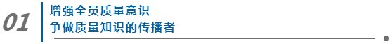 质量是企业生存发展之本,与我们的日常工作息息相关。我们要坚持“零缺陷"质量理念,主动学习质量知识,提高质量意识,不断学习先进的质量控制技术和方法,努力提升自身操作技能;在深入学习质量知识的基础上,通过宣传栏、网络、微信等媒介宣传质量知识,形成人人关注质量、全员重视质量的浓厚氛围。