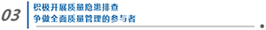 我们要牢固树立“隐患就是事故”的理念,根据不同岗位工作特点进行质量隐患排查,对照标准自查自纠,全面加强关键岗位、关键工序的质量管控,对发现的不符合项要积极落实整改纠正,要加强质量问题的整改验证和闭环管理,坚决杜绝同类问题多次出现。
