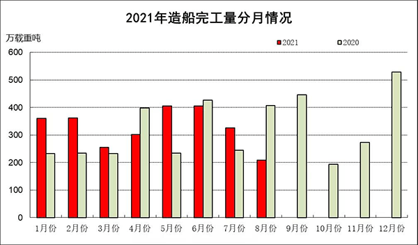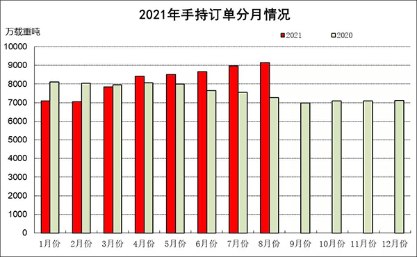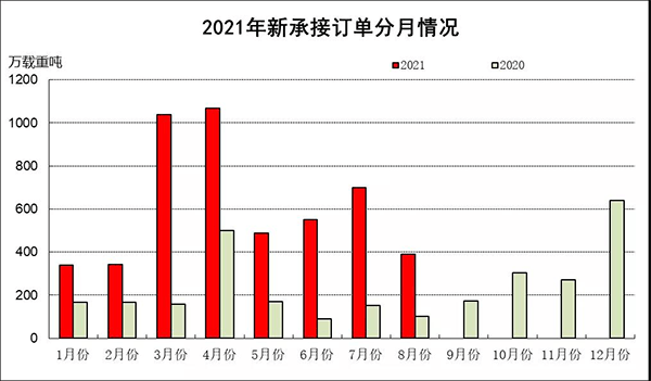 1–8月份,全国造船完工2626万载重吨,同比增长9.0%。承接新船订单4911万载重吨,同比增长227.2%。8月底,手持船舶订单9147万载重吨,同比增长26.0%,比2020年底手持订单增长28.6%。