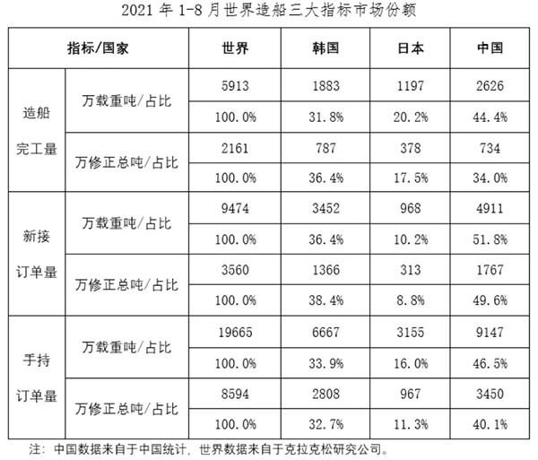 1–8月,我国造船完工量、新接订单量、手持订单量分别占世界市场份额的44.4%、51.8%和46.5%。