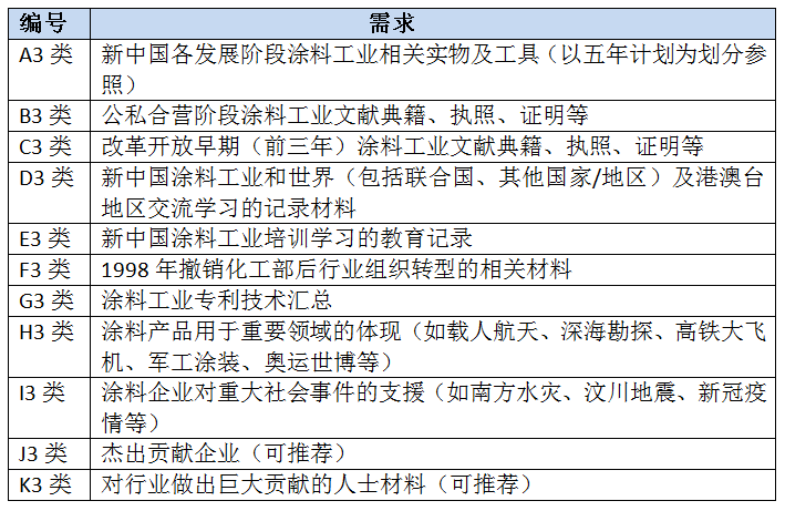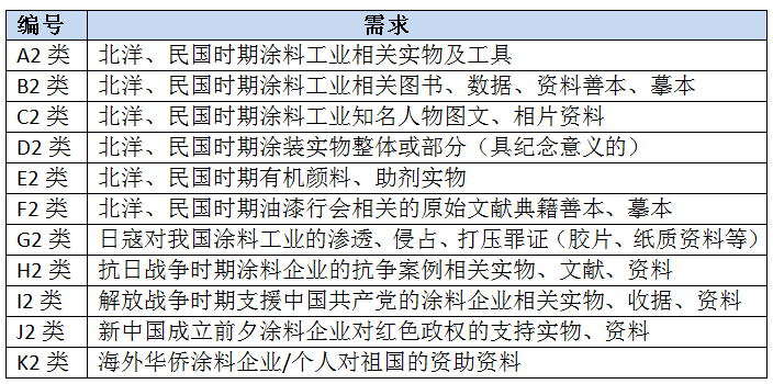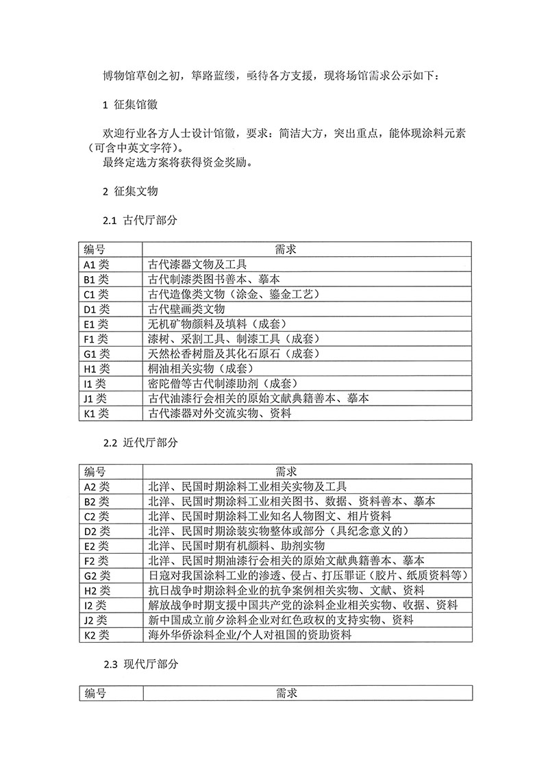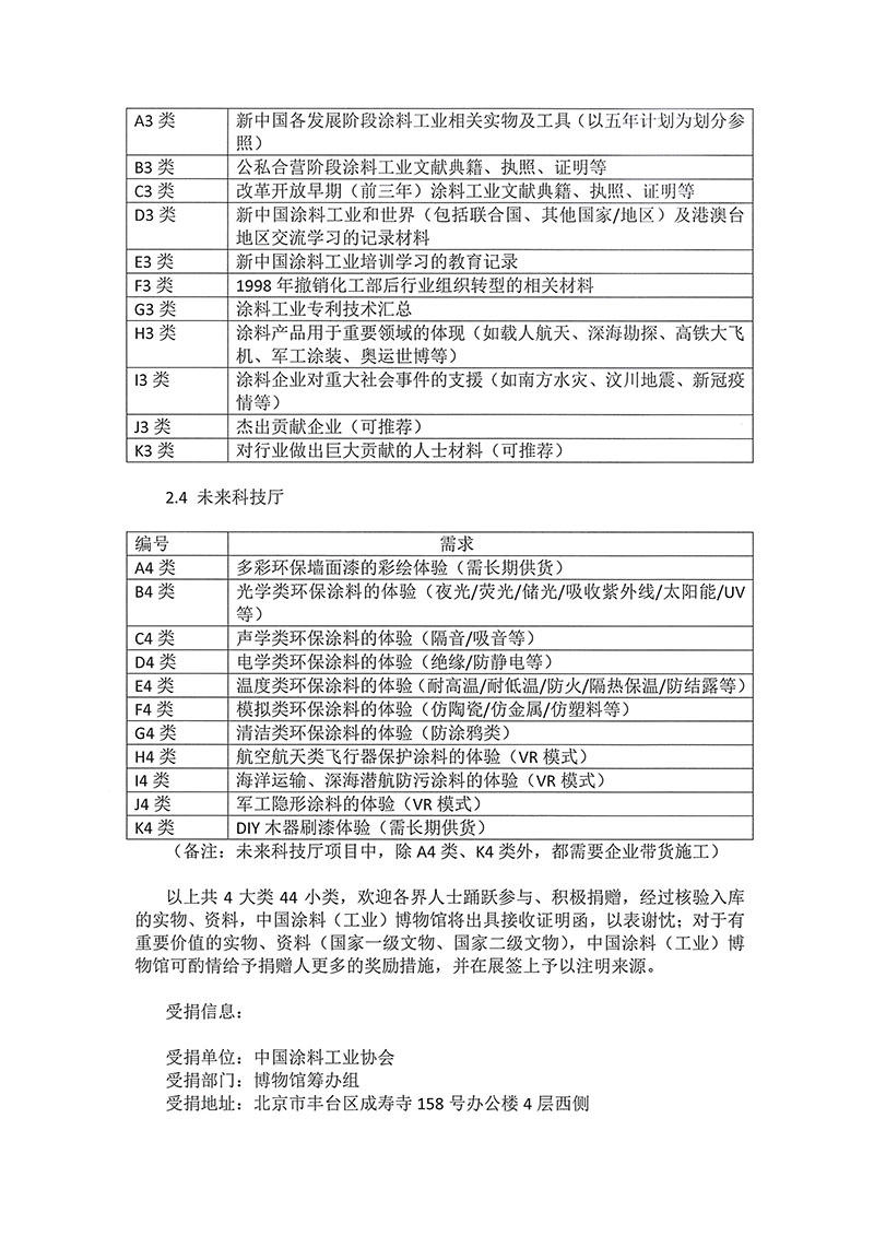 以上共4大类44小类,欢迎各界人士踊跃参与、积极捐赠,经过核验入库的实物、资料,中国涂料(工业)博物馆将出具接收证明函,以表谢忱;对于有重要价值的实物、资料(国家一级文物、国家二级文物),中国涂料(工业)博物馆可酌情给予捐赠人更多的奖励措施,并在展签上予以注明来源。