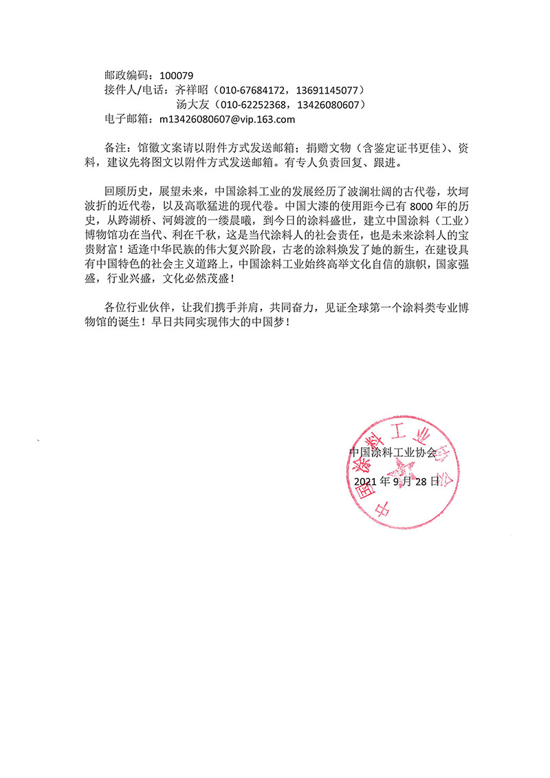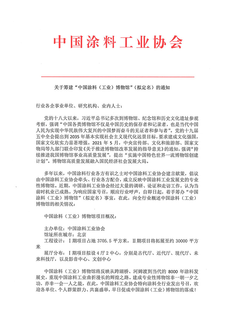 中国涂料(工业)博物馆将反映从跨湖桥、河姆渡到当代的8000年涂料发展史,重现中国涂料工业曲折漫长的辉煌之路。建成专业性博物馆非一朝一夕之功,亦非一会一人之能,在此,best365中国官方网站特向涂料全行业发出号召,欢迎各单位、个人群策群力、共襄盛举,早日促成中国涂料(工业)博物馆的落成!