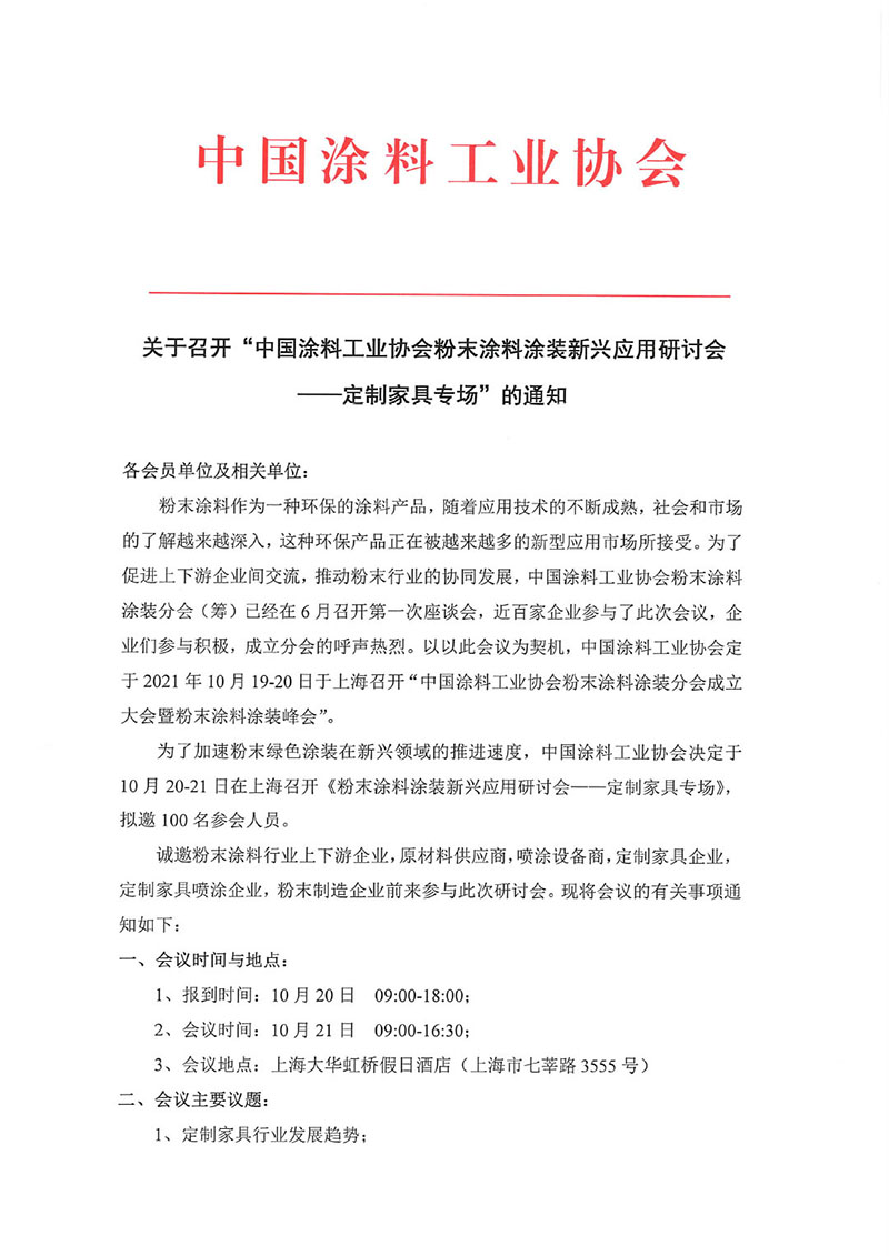 诚邀粉末涂料行业上下游企业,原材料供应商,喷涂设备商,定制家具企业,定制家具喷涂企业,粉末制造企业前来参与此次研讨会。现将会议的有关事项通知如下: