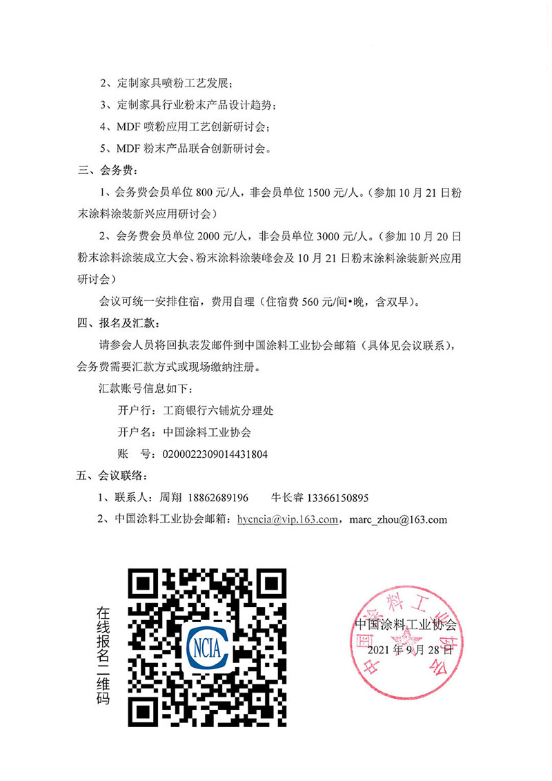 2、会务费会员单位2000元/人,非会员单位3000元/人。(参加10月20日粉末涂料涂装成立大会、粉末涂料涂装峰会及10月21日粉末涂料涂装新兴应用研讨会)