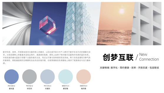 数字科技、效率、开放联结是千禧时代的核心主题,三棵树用中高彩度的睿光蓝传达出可靠与效率感,以灰色作为传达理性冷静气质的基调色,而空镜碧的通透感与海天橙的自由灵动又为极简理智增添了活力与趣味。