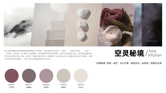 这套视觉色彩整体呈现舒缓柔软的视觉感知,粉蜡及卡其色系咖色系的烟墨棕与时光花影中的红芍紫、粉纱罗相遇相知,雅致色调中带有一抹精致感,砂砾色与云月山则传递出缓和空旷的情致。