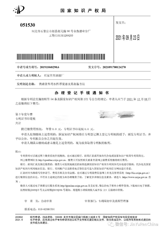 近日,石家庄市油漆厂收到国家知识产权局通知,又双叒叕获1项国家发明专利授权: