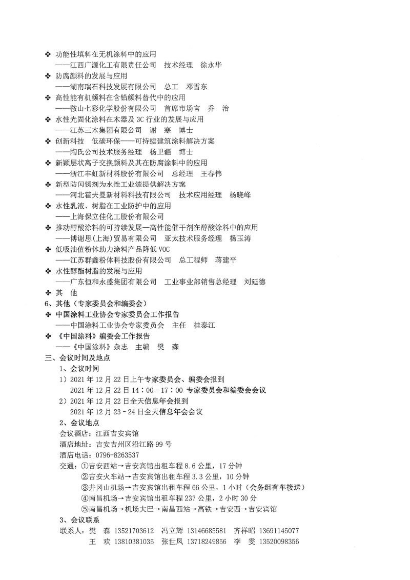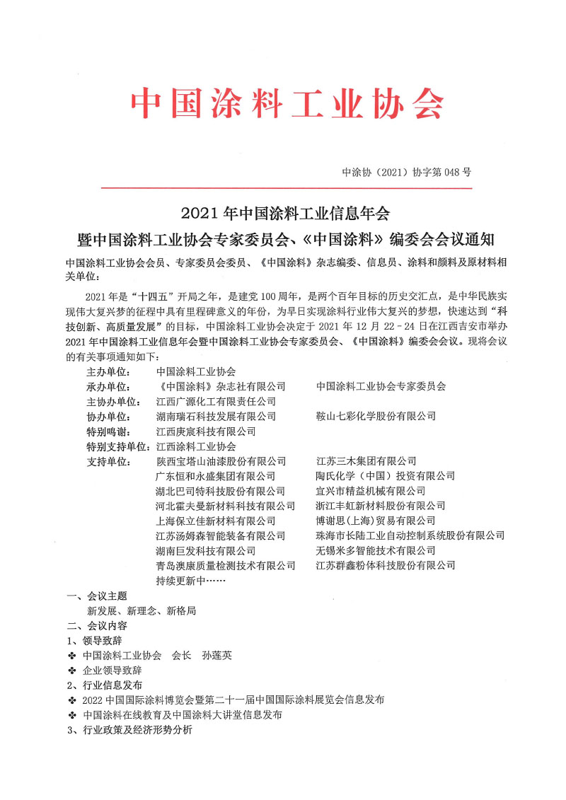 2021年是“十四五”开局之年,是建党100周年,是两个百年目标的历史交汇点,是中华民族实现伟大复兴梦的征程中具有里程碑意义的年份,为早日实现涂料行业伟大复兴的梦想,快速达到“科技创新、高质量发展”的目标,best365中国官方网站决定于2021年12月22–24日在江西吉安市举办2021年中国涂料工业信息年会暨best365中国官方网站专家委员会、《中国涂料》编委会会议。现将会议的有关事项通知如下: