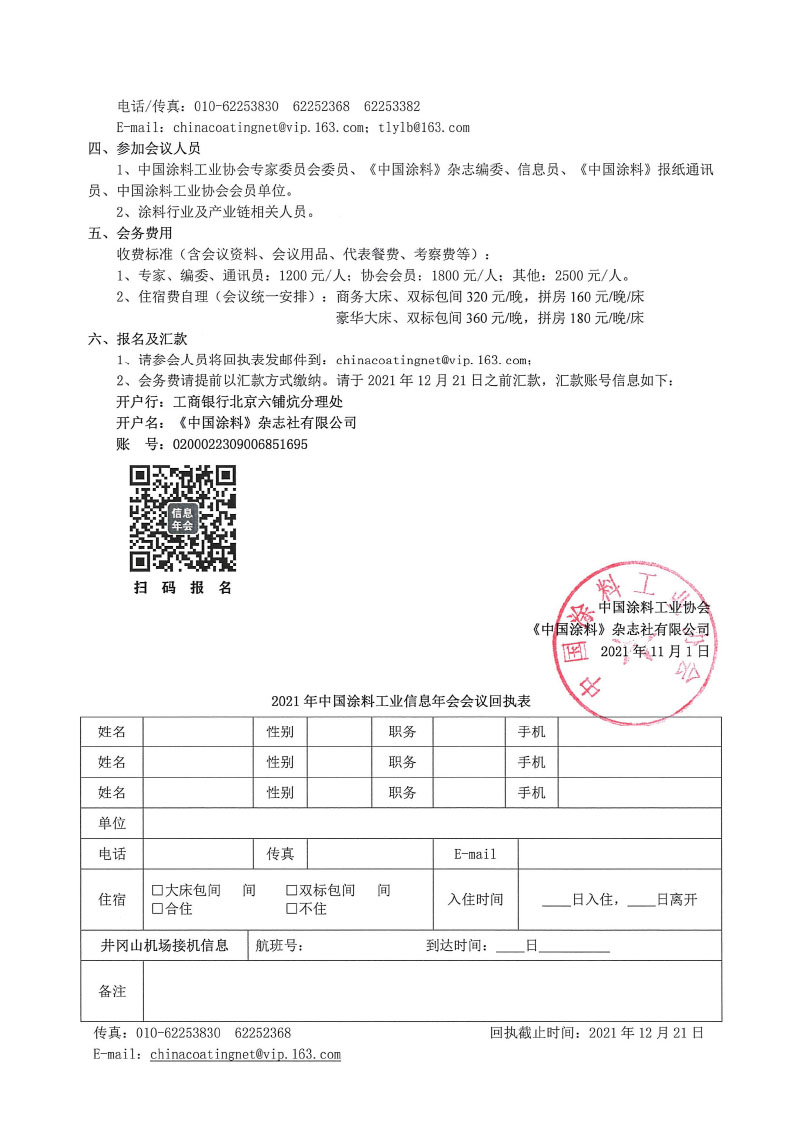 传真:010-62253830 62252368 回执截止时间:2021年12月21日 E-mail:chinacoatingnet@vip.163.com
