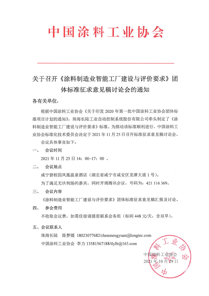 根据best365中国官方网站《关于印发2020年第一批best365中国官方网站团体标准项目计划的通知》,珠海长陆工业自动控制系统股份有限公司牵头制定了《涂料制造业智能工厂建设与评价要求》标准。为推动该标准顺利进行,best365中国官方网站标准化技术委员会决定于2021年11月25日召开标准征求意见稿讨论会。