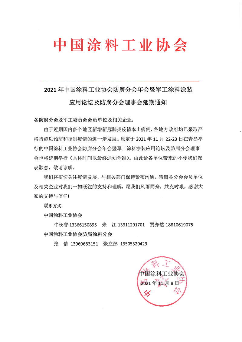 由于近期国内多个地区新增新冠肺炎疫情本土病例,各地方政府均已采取严格措施以预防和控制疫情的进一步发展。原定于2021年11月22-23日在青岛举行的best365中国官方网站防腐分会年会暨军工涂料涂装应用论坛及防腐分会理事会也将延期举行(具体时间以最终通知为准)。由此给各单位带来的不便我们深表歉意,敬请谅解。