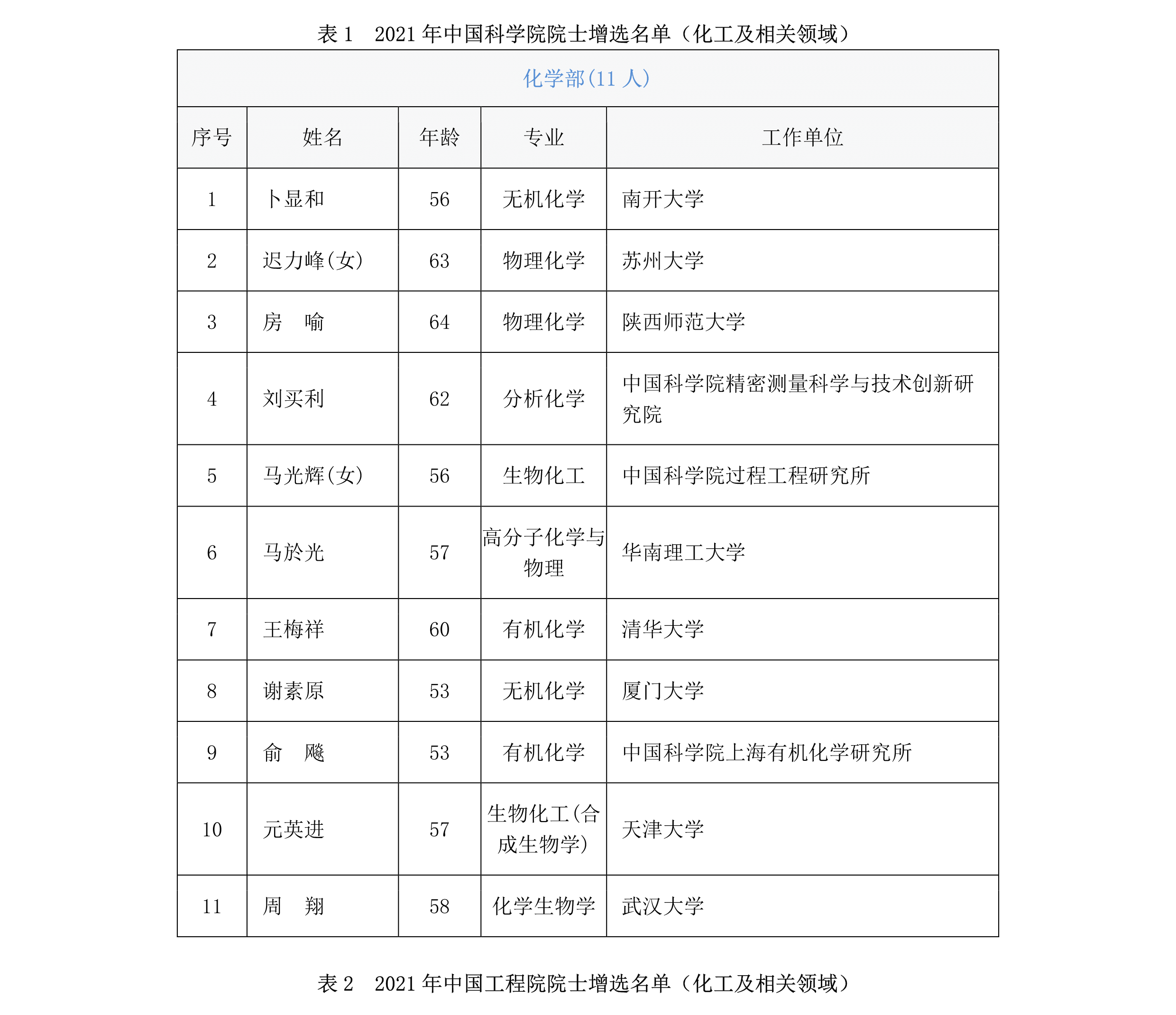 其中,中国科学院院士增选名单中共有11人来自化学部(见表1),中国工程院院士增选名单中共有8人来自化工等相关领域(见表2)。