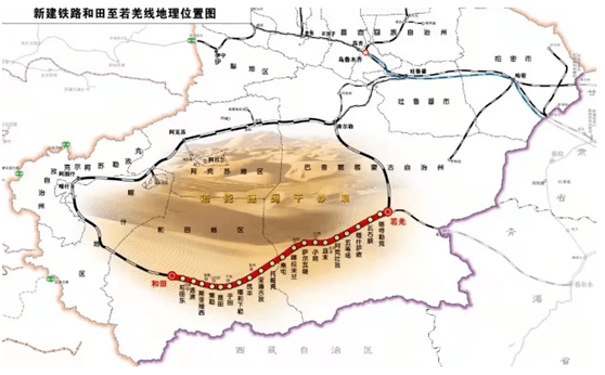 和若铁路全长800余公里,连接新疆维吾尔自治区南部的和田地区与巴音郭楞蒙古自治州若羌县。和若铁路西接喀和铁路,东连格库铁路,这三条铁路与南疆铁路共同构成了环塔克拉玛干沙漠铁路环线,这也是世界上首条绕沙漠环形铁路。