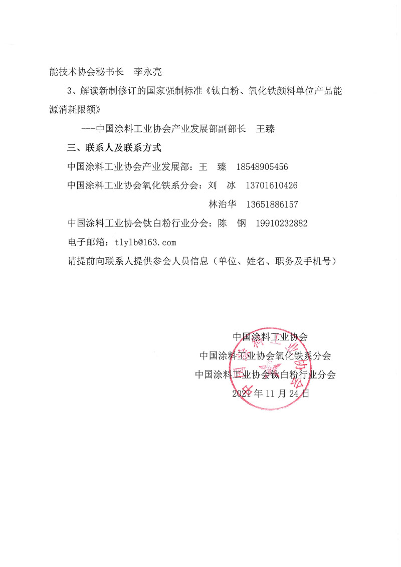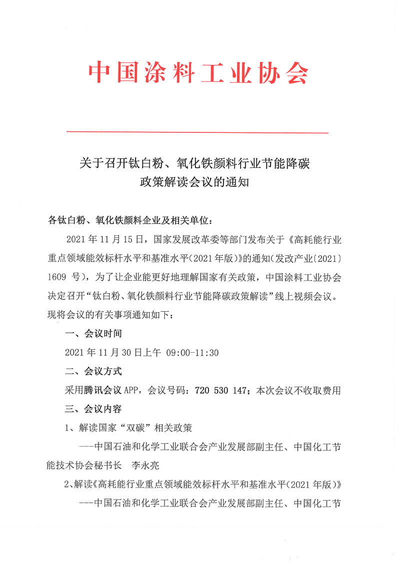 2021年11月15日,国家发展改革委等部门发布关于《高耗能行业重点领域能效标杆水平和基准水平(2021年版)》的通知(发改产业〔2021〕1609号),为了让企业能更好地理解国家有关政策,best365中国官方网站决定召开“钛白粉、氧化铁颜料行业节能降碳政策解读”线上视频会议。现将会议的有关事项通知如下: