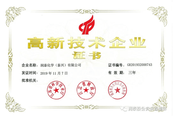 润泰化学(泰兴)有限公司技术中心凭借强大的人才团队、不断的研发投入、浓厚的创新氛围,在众多企业中脱颖而出,成功晋升为省级企业技术中心。