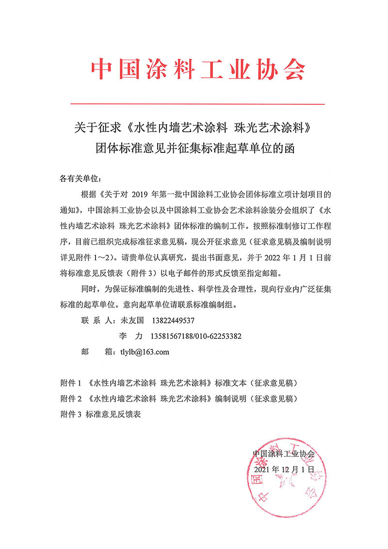 根据《关于对2019年第一批best365中国官方网站团体标准立项计划项目的通知》,best365中国官方网站以及best365中国官方网站艺术涂料涂装分会组织了《水性内墙艺术涂料 珠光艺术涂料》团体标准的编制工作。按照标准制修订工作程序,目前已组织完成标准征求意见稿,现公开征求意见(征求意见稿及编制说明详见附件1~2)。请贵单位认真研究,提出书面意见,并于2022年1月1日前将标准意见反馈表(附件3)以电子邮件的形式反馈至指定邮箱。