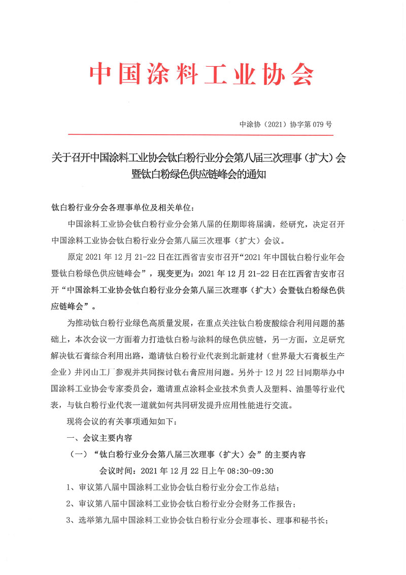 原定2021年12月21-22日在江西省吉安市召开“2021年中国钛白粉行业年会暨钛白粉绿色供应链峰会”,现变更为:2021年12月21-22日在江西省吉安市召开“best365中国官方网站钛白粉行业分会第八届三次理事(扩大)会暨钛白粉绿色供应链峰会”。
